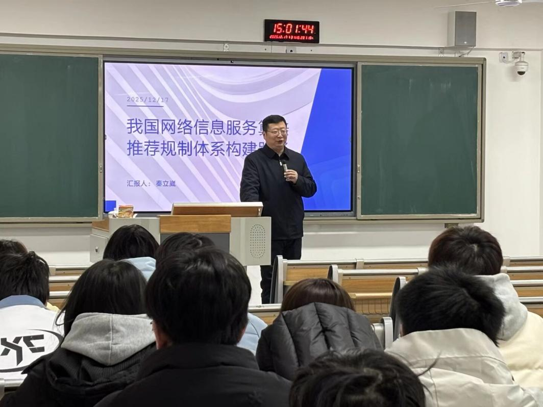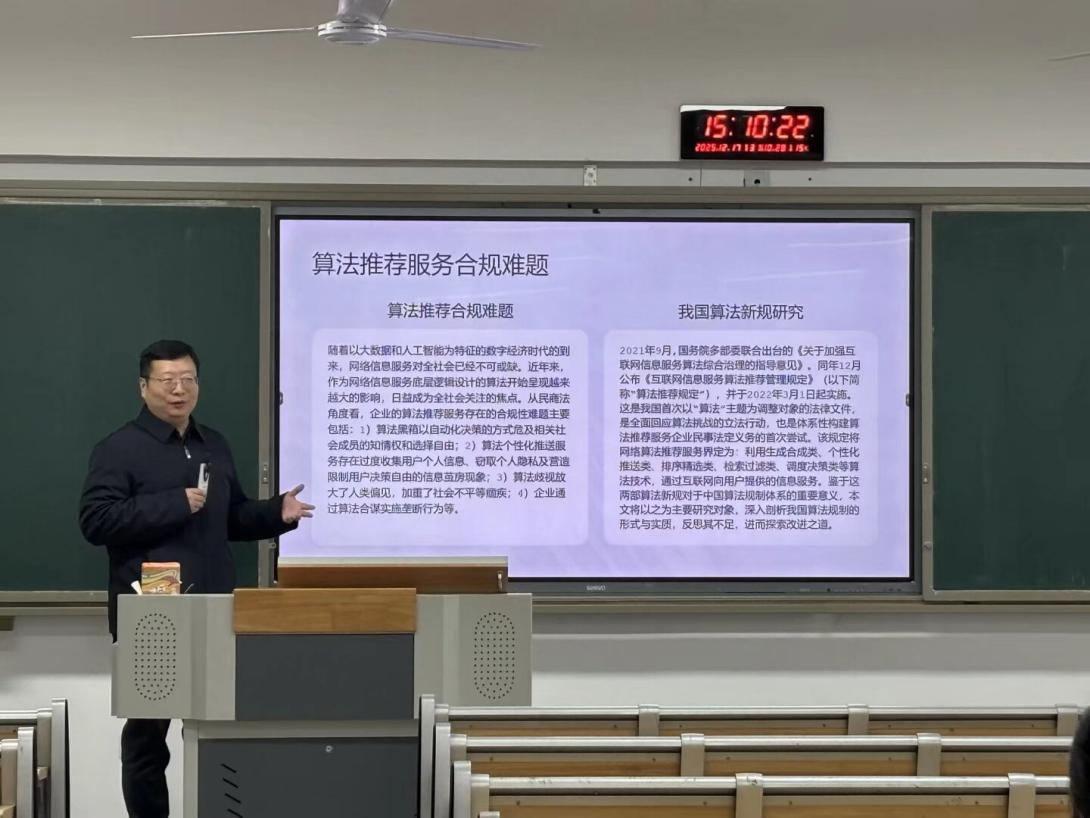 为深化师生对算法推荐服务法律规制的理解,探索数字时代算法治理的民事法律路径,12月17日,学院在东区B502举办了主题为“我国算法推荐服务提供者的民事法定义务体系构建”的学术讲座。本次讲座由秦立崴教授担任主讲人,知识产权专业师生及对算法治理领域感兴趣的同学到场聆听、互动交流,现场氛围热烈。